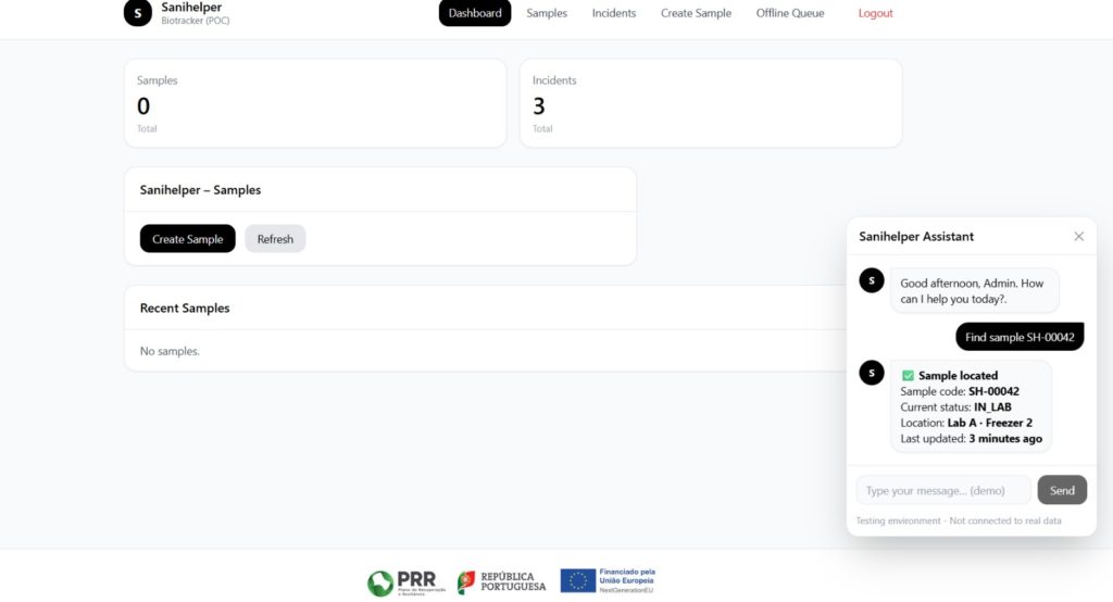 SaniHelper is a digital biotracking platform designed to support animal health surveillance and outbreak response. It streamlines the creation, georeferencing, and traceability of field samples, and provides fast retrieval of sample status and storage location (e.g., lab/freezer) through a simple interface and an assistant-style search. Built with field operations in mind, it supports offline workflows and synchronised updates to maintain continuity from collection to laboratory handling.